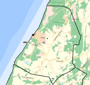 Nedenstående kort viser vandværkets forsyningsområde. Kortet viser også vandværkets placering samt grundvandsboringerne. (Den sydligste grundvandsboring er to boringer.)